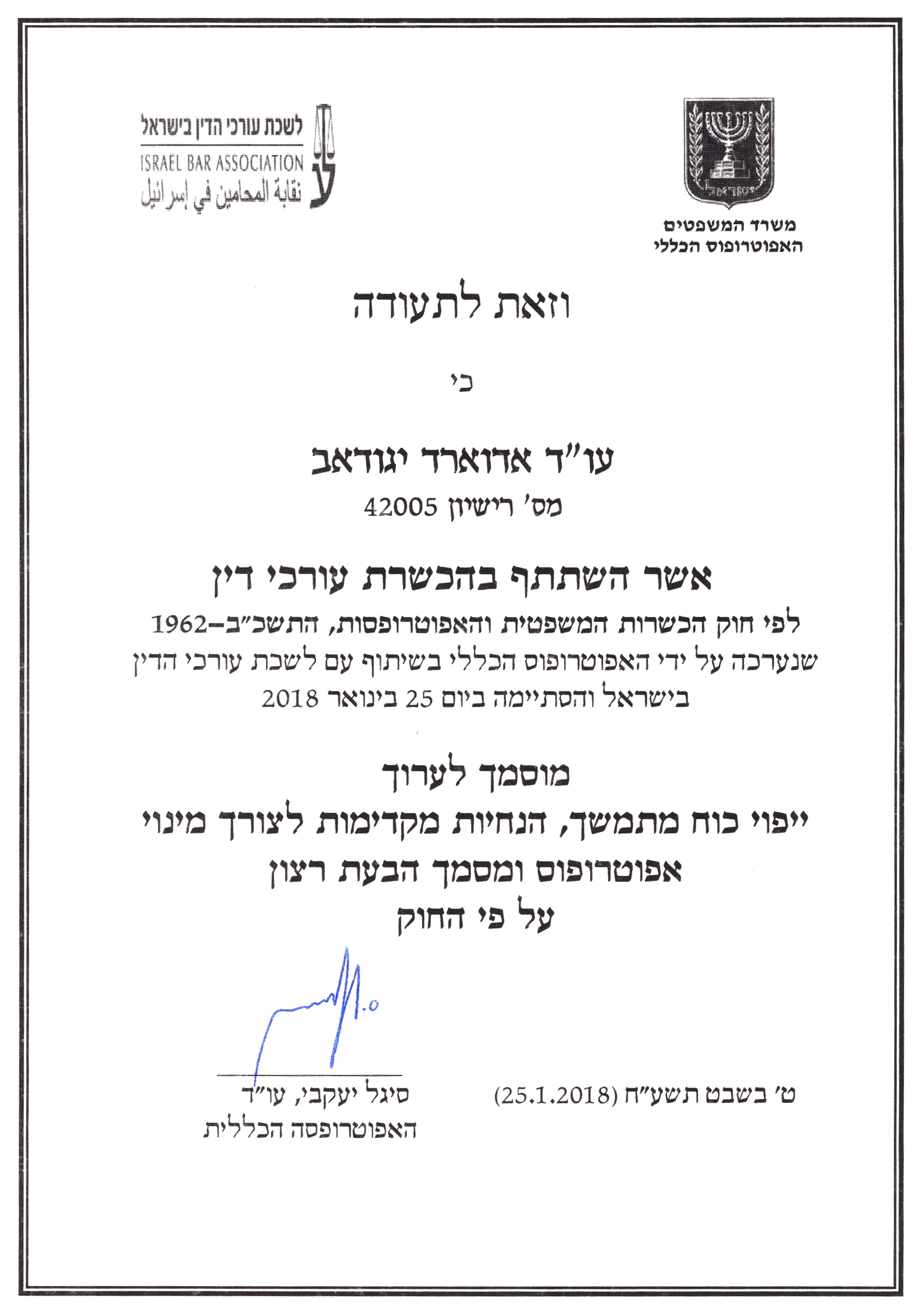 האפוטרופוס הכללי מנפיק תעודה של רישום, אשר מיופה הכח עשוי לאחר מכן להזדקק לו בכדי להשתמש ביופי כח המאשר כי הוא פועל מתוקף הסמכויות המוקנות לו. גם אם בחרת שיפוי הכוח המתמשך שלך יהיה תקף רק ממועד בו לא תהיה לך עוד יכולת לנהל את עניינך, עדיין עליך לרשום אותו בהקדם האפשרי, כך שמיופה הכח יוכל להשתמש בו בעתיד לכשידרש.